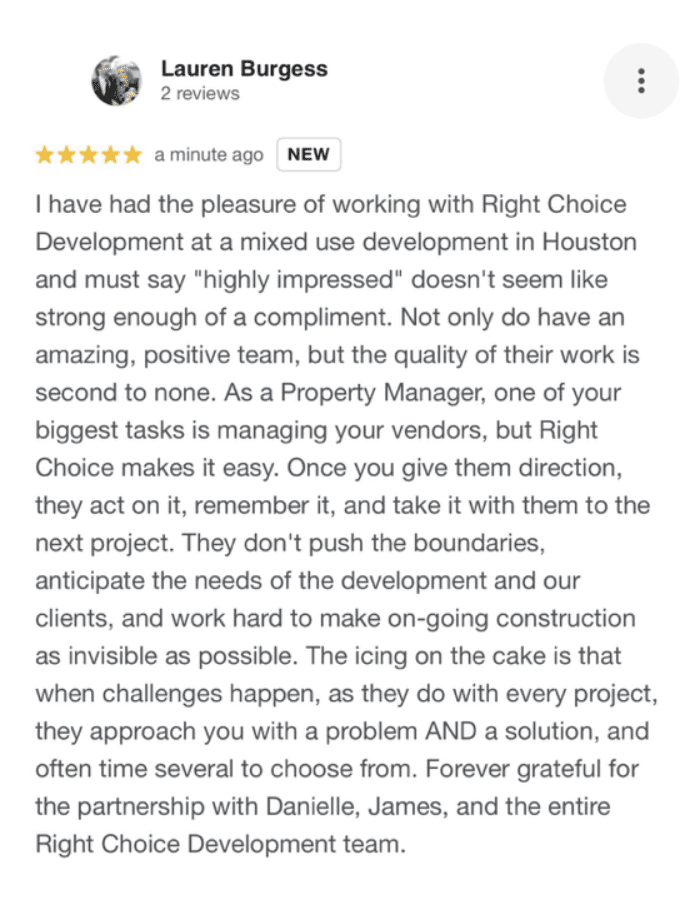 Our CEO, Danielle Wright, recently blogged about the word-of-mouth referrals given out by our valued clients. We appreciate it when our name is shared throughout Houston networks by developers, property managers, and other stakeholders. Right Choice Construction is a full-service contractor known for quality work and reliability, as well as a strong commitment to safety and innovation. It’s no wonder we are a recommended commercial general contractor. See a sampling of our online five-star testimonials here.