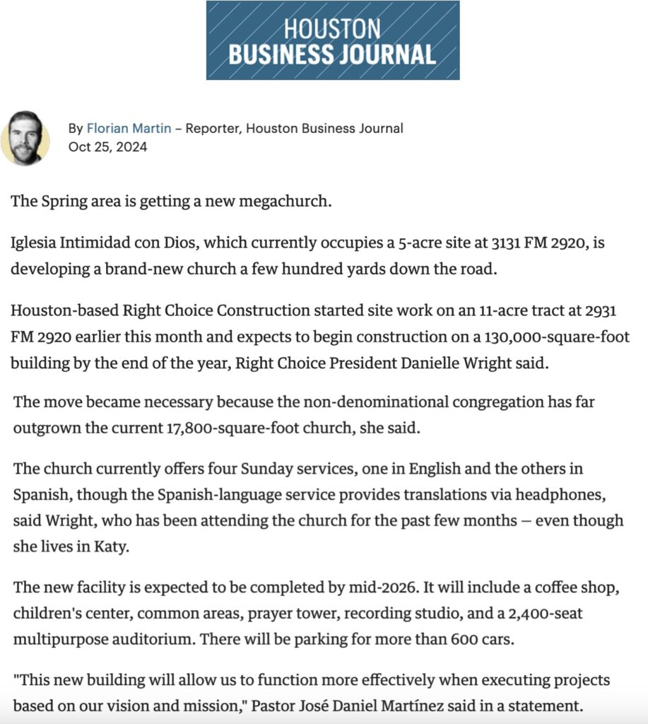 As a megachurch construction contractor, we are pleased to announce that our company is building the Intimidad Con Dios worship center in the northern Houston Area of Spring, Texas! Right Choice Construction, a premier general contractor, has already broken soil on this 18,000 megachurch project. Several media outlets, including KHOU and Houston Business Journal, have covered the exciting news. Below is a screenshot highlighting the project.